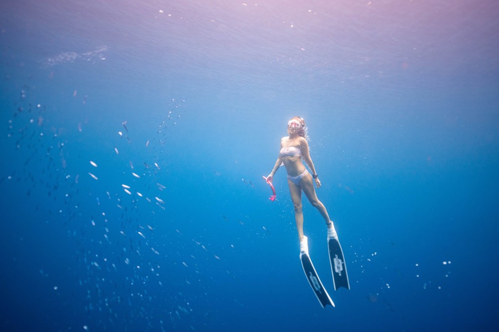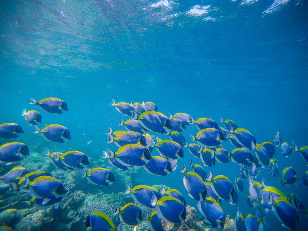 紅色多半在 10 英尺深的水域被吸收。橙色和黃色波長不超過 25 英尺就會消失,留下了藍色。更深的水域只剩紫羅蘭色和紫外光。[12]